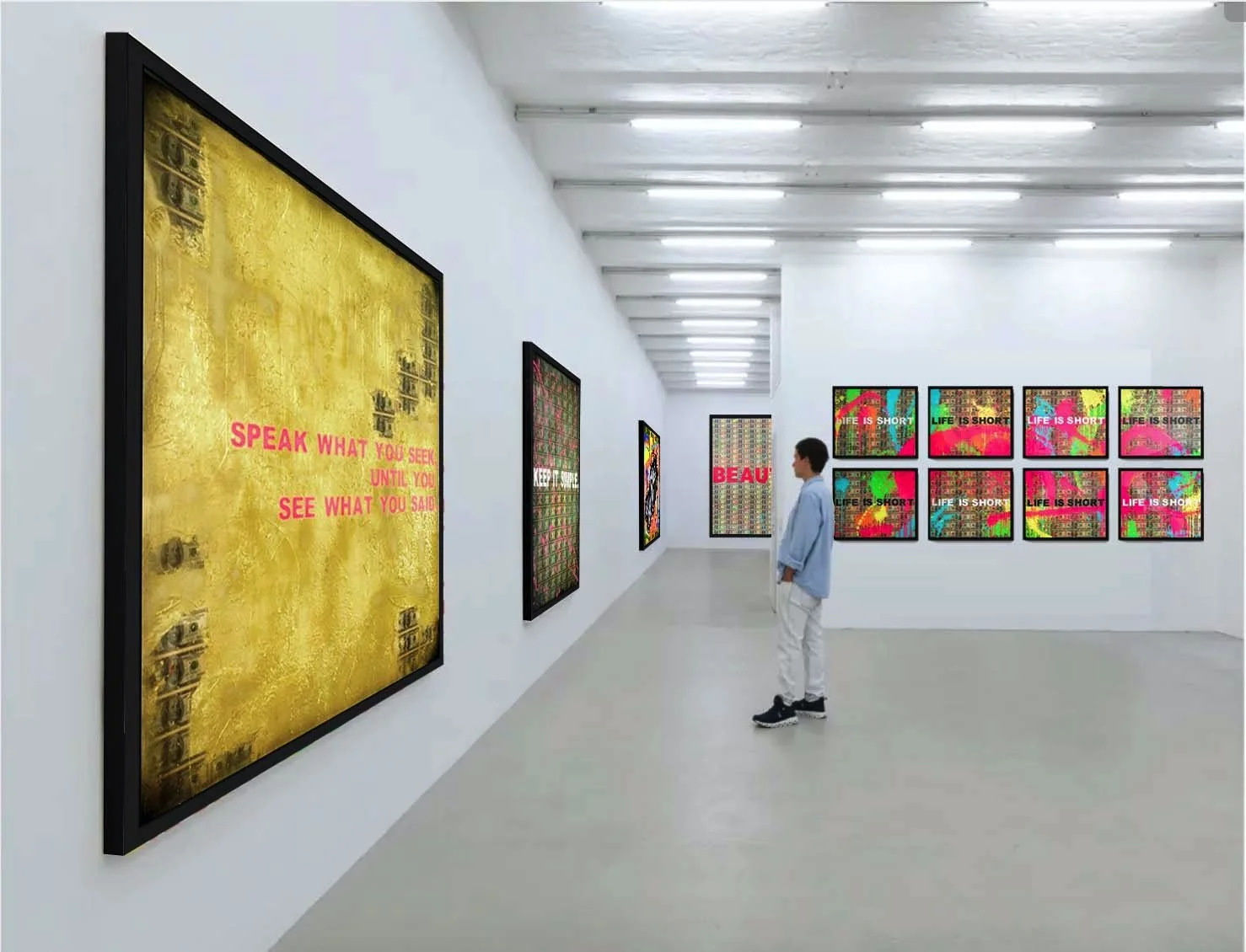 Stevie Chow is a self-taught Canadian artist whose work is characterized by his use of acrylic, resin, and found objects to create large-scale paintings that are meant to serve as uplifting prompts for the homes of his collectors. Throughout his oeuvre, one can find a recurring theme of incorporating mindful text prompts that reflect his desire to use positive imagery and affirmations to counteract the distractions of modern life.